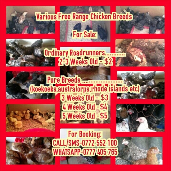 Australorps, Rhode Island, Chicks, Mature breeding stock Roadrunner meat Contact: 0777405765 and 0772552100